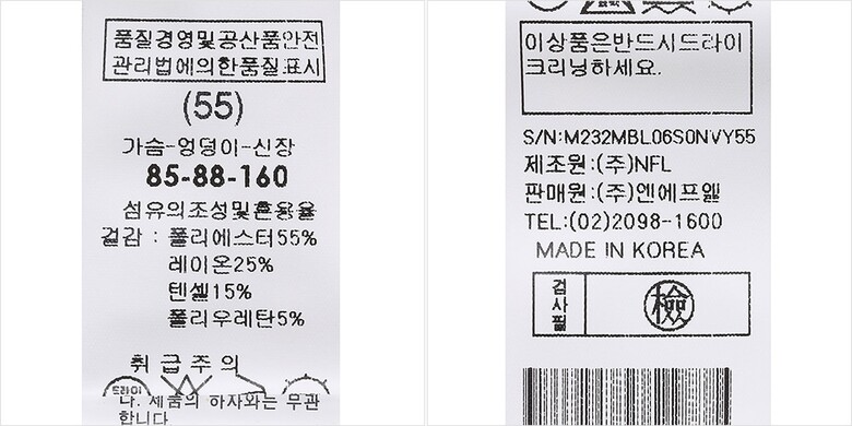 | 1. 제품 소재 (섬유의 조성 또는 혼용률을 백분율로 표시, 기능성인 경우 성적서 또는 허가서) | 겉감-폴리에스터55% 폴리우레탄5% 레이온25% 텐셀15% |