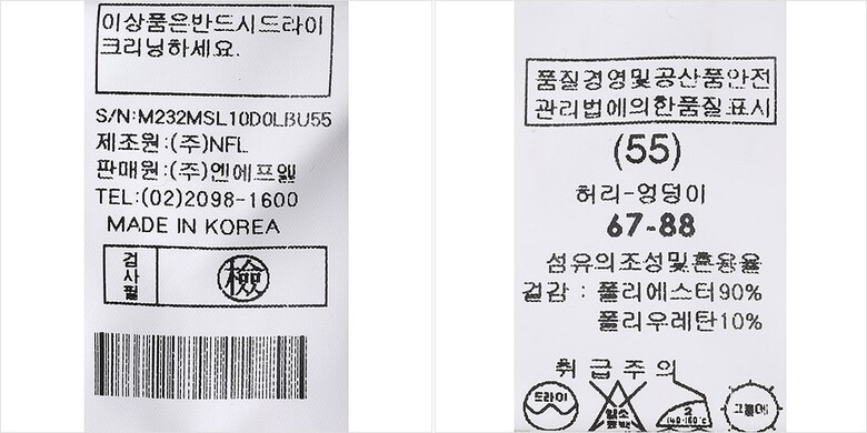 1. 제품 소재 (섬유의 조성 또는 혼용률을 백분율로 표시, 기능성인 경우 성적서 또는 허가서) 겉감-폴리에스터90% 폴리우레탄10%