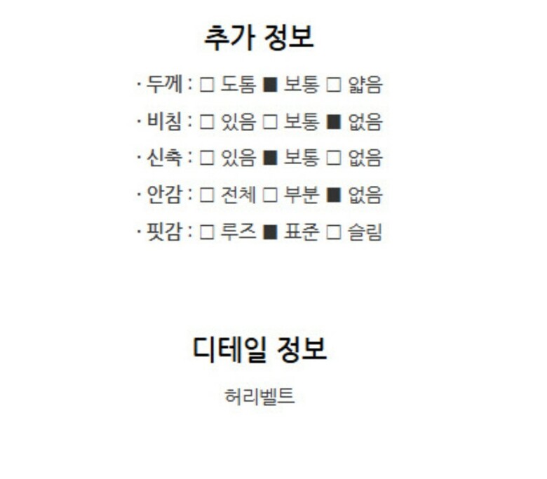 | 1. 제품 소재 (섬유의 조성 또는 혼용률을 백분율로 표시, 기능성인 경우 성적서 또는 허가서) | 상품상세참조 |