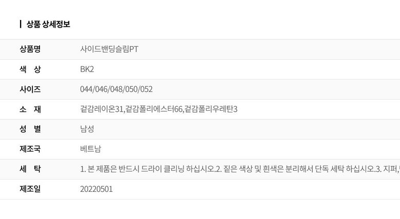 | 1. 제품 소재 (섬유의 조성 또는 혼용률을 백분율로 표시, 기능성인 경우 성적서 또는 허가서) | 겉감레이온31,겉감폴리에스터66,겉감폴리우레탄3 |