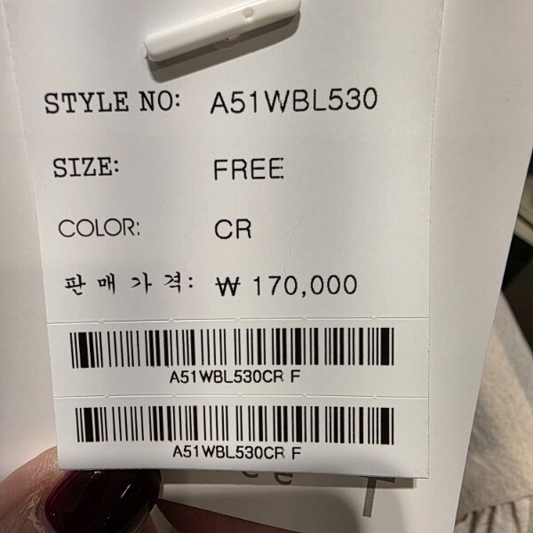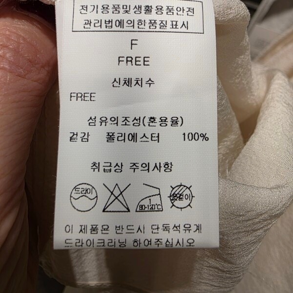 치수 : FREE 가슴단면 52, 소매길이 59, 총장 61