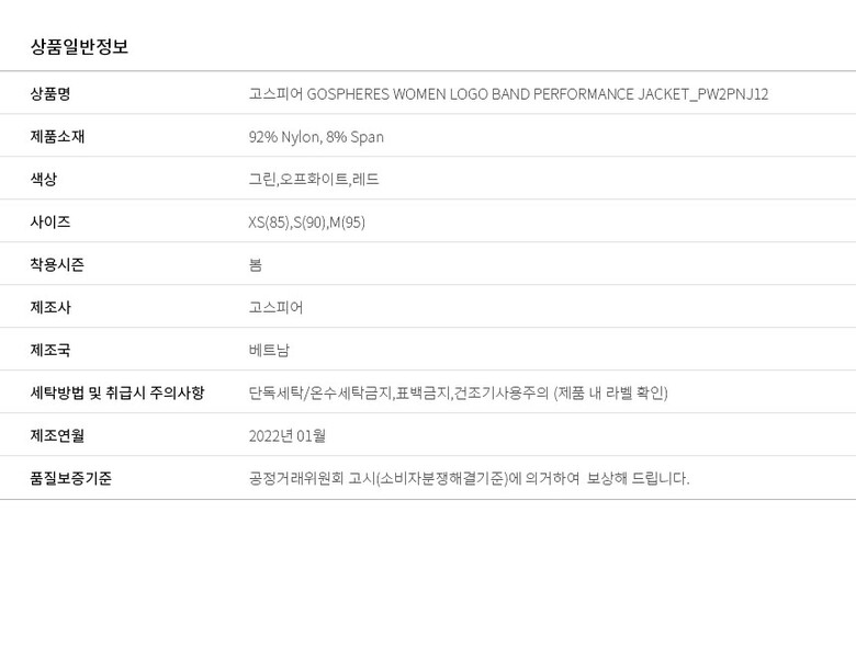 | 6. 세탁방법 및 취급시 주의사항 | 단독세탁/온수세탁금지,표백금지,건조기사용주의 (제품 내 라벨 확인) |