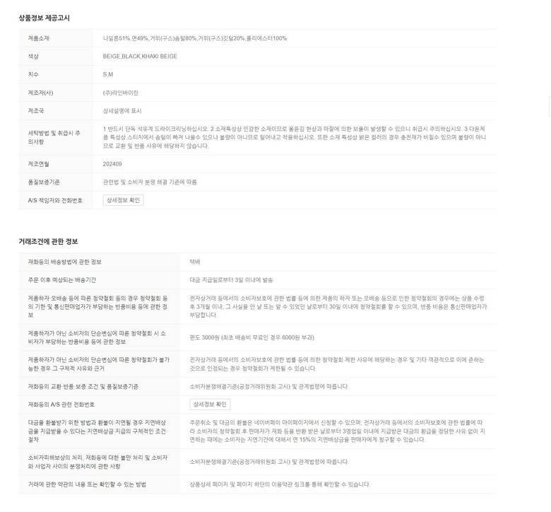 1. 제품 소재 (섬유의 조성 또는 혼용률을 백분율로 표시, 기능성인 경우 성적서 또는 허가서) | 상품상세참조 |