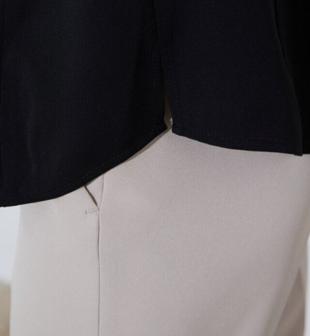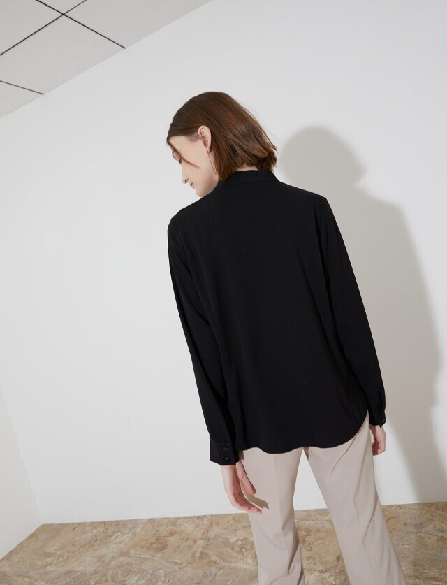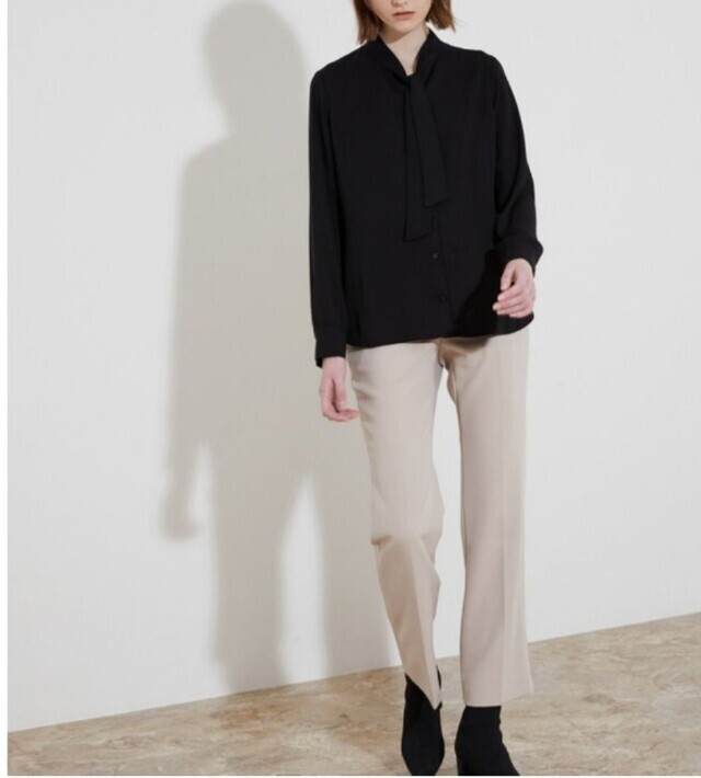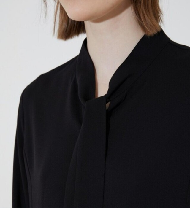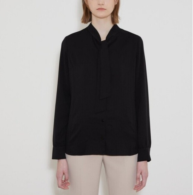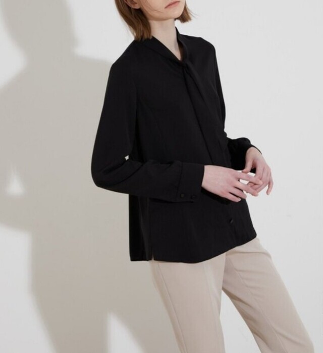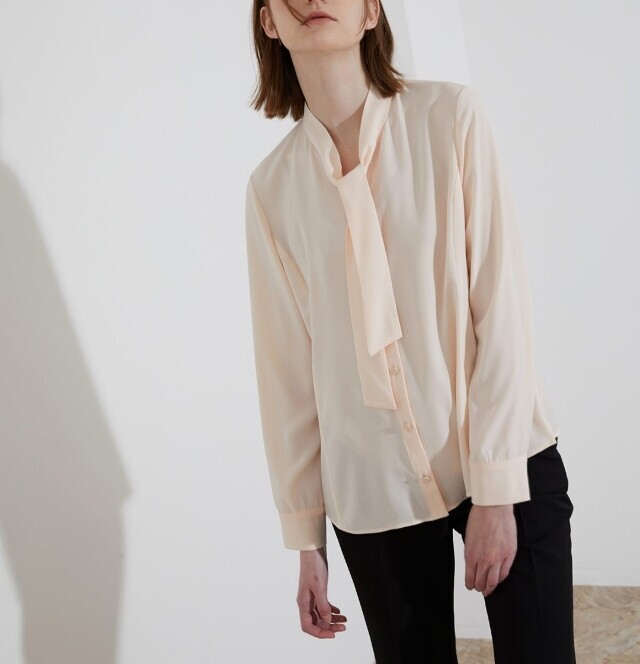 페미니한 라인의 블라우스로 네크에 타이처럼