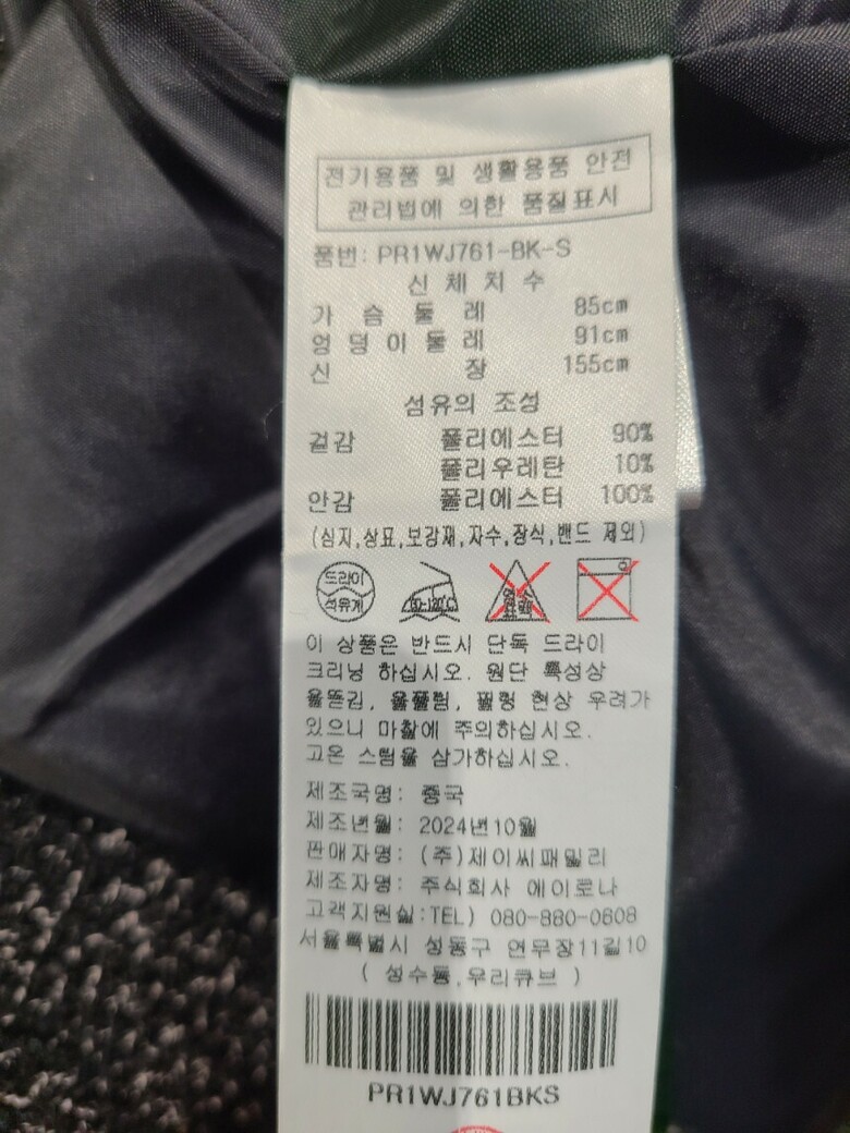 | 1. 제품 소재 (섬유의 조성 또는 혼용률을 백분율로 표시, 기능성인 경우 성적서 또는 허가서) | 폴리우레탄 10% / 안감:폴리에스테르 100% |