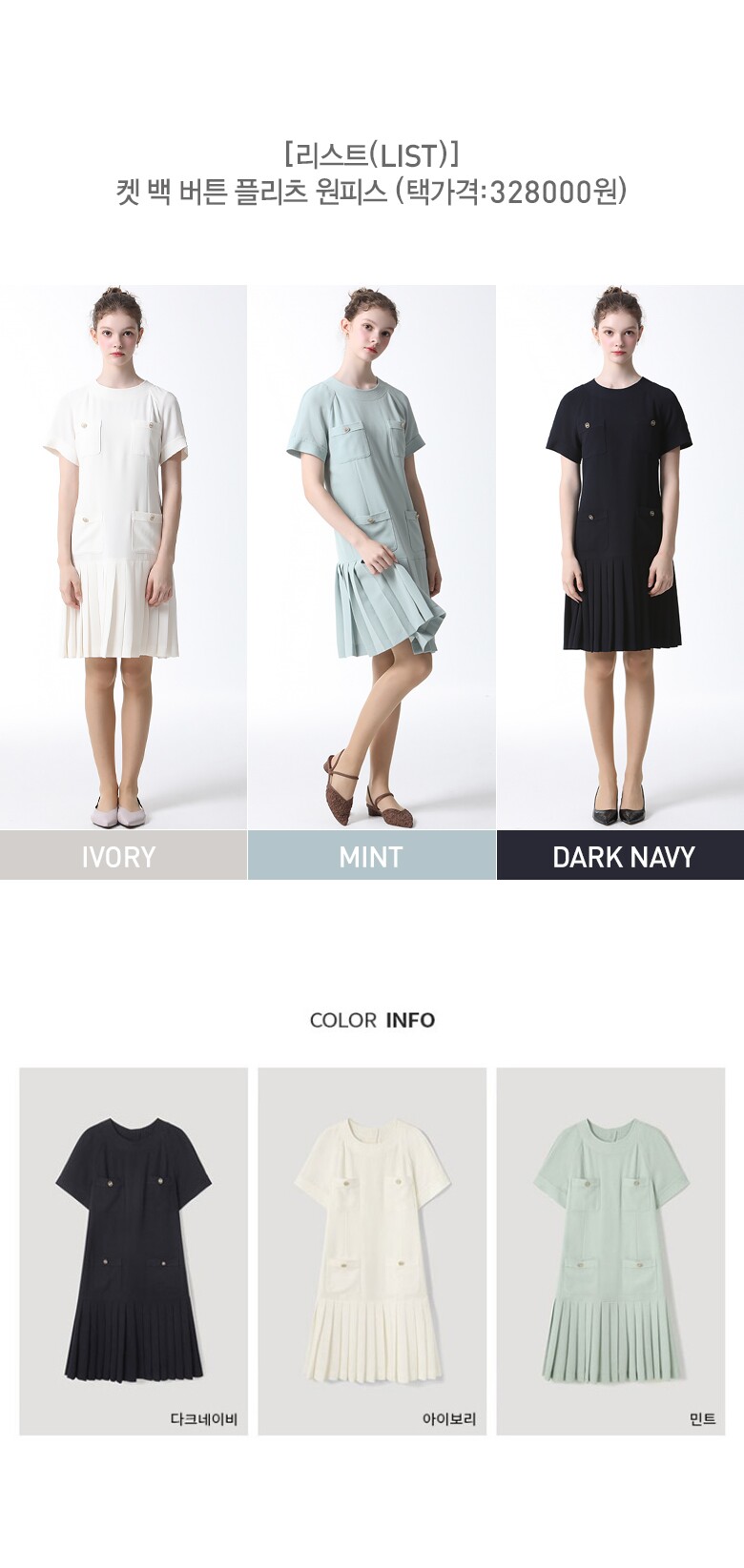 ▶ ITEM : 켓 백 버튼 플리츠 원피스 ▶ NUMBER : TWWOPM60090 ▶ FABRIC : [겉감] 폴리에스터 100% [안감] 폴리에스터 100% ▶ WASHING : 단독 드라이클리닝 ▶ 원 산 지 : 베 트 남 ▶ 색 상 : 민트(MI),아이보리(IV),다크네이비(DN)