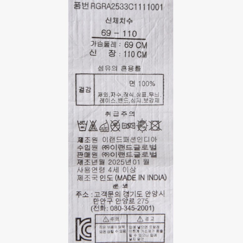 | 1. 제품 소재 (섬유의 조성 또는 혼용률을 백분율로 표시, 기능성인 경우 성적서 또는 허가서) | 상품상세참조 |