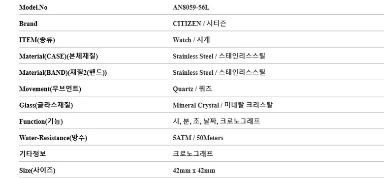 | 7. 주요 사양 | 스테인리스스틸 시계 쿼츠 |