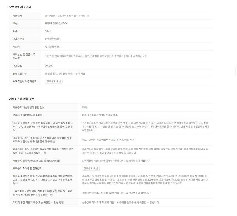 | 6. 세탁방법 및 취급시 주의사항 | 상품상세참조 |