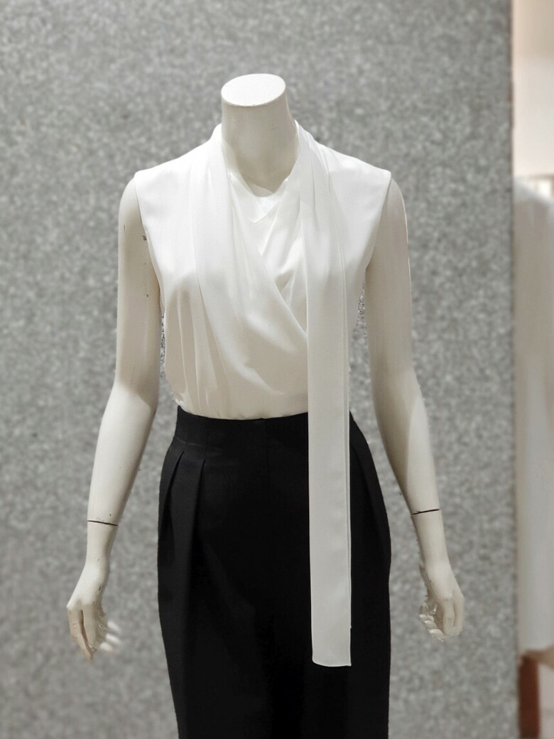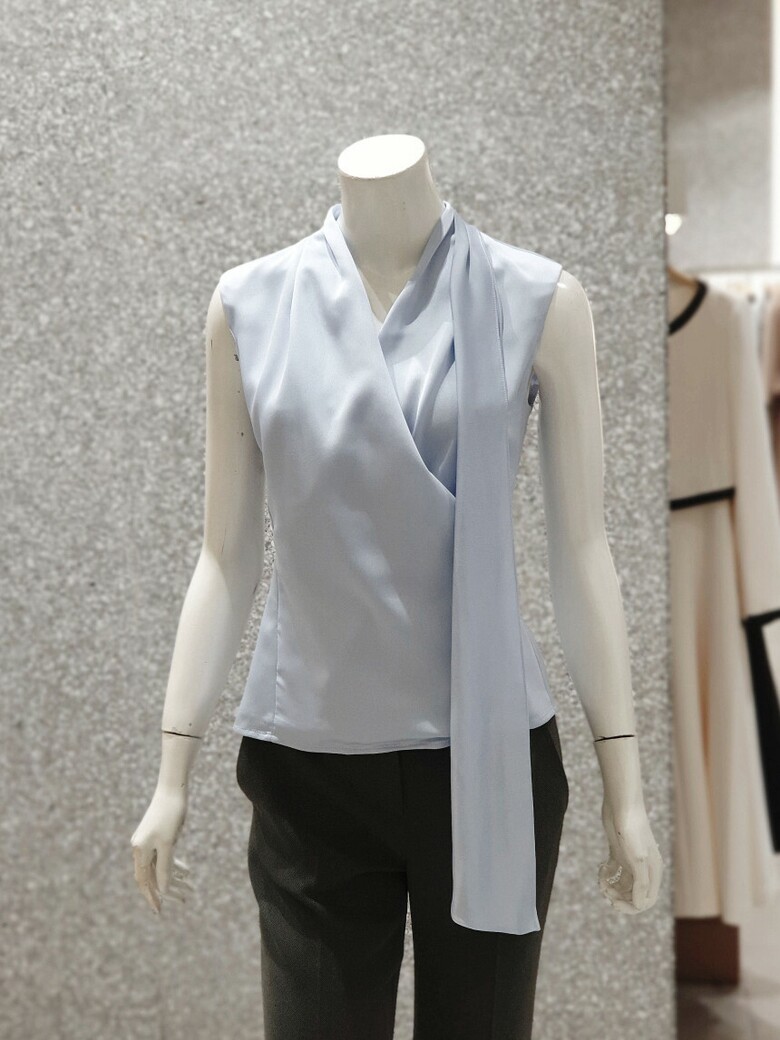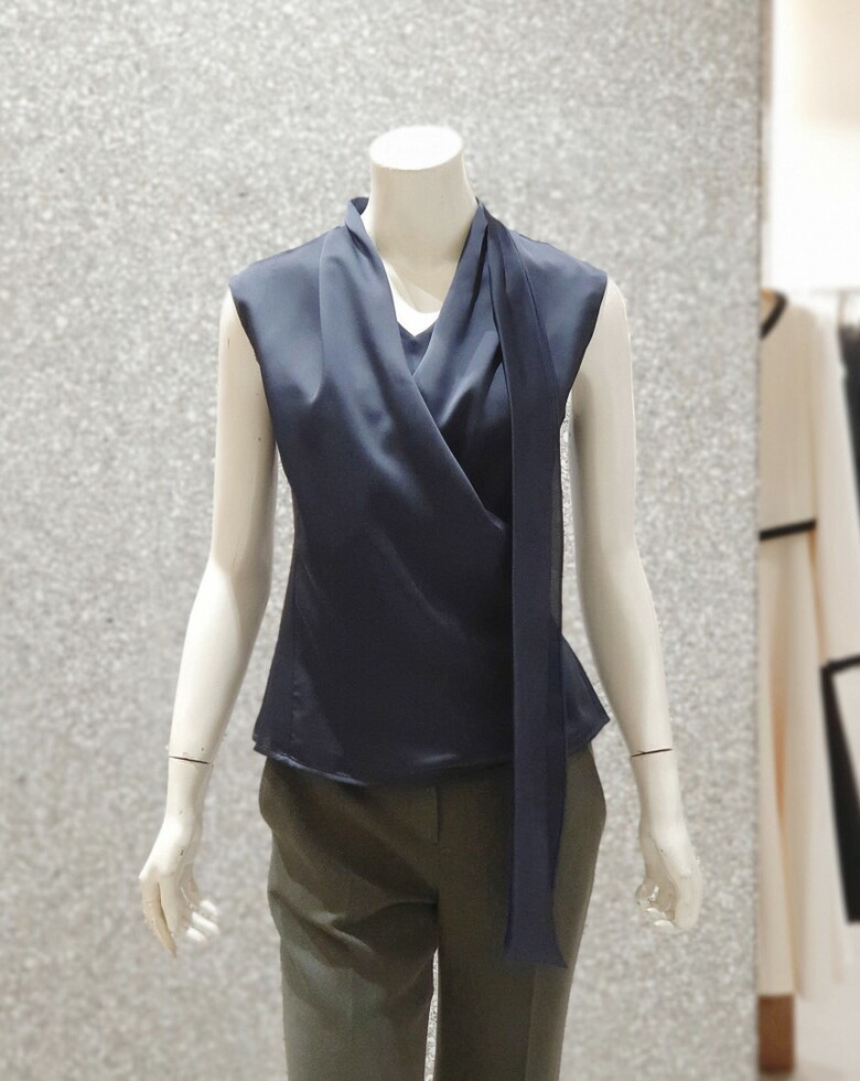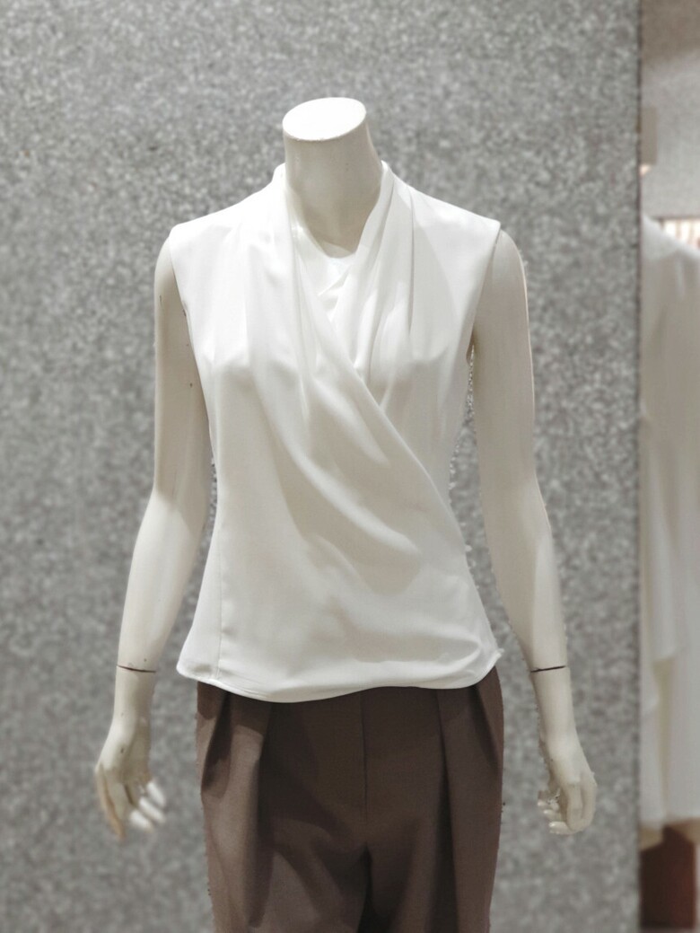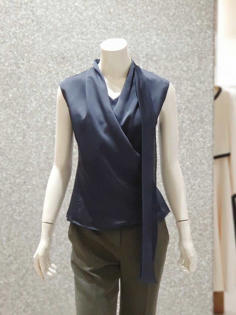 우아한 드레이프 실루엣이 돋보이는 민소매 블라우스입니다.