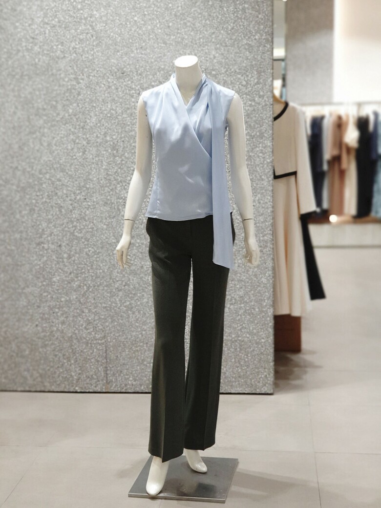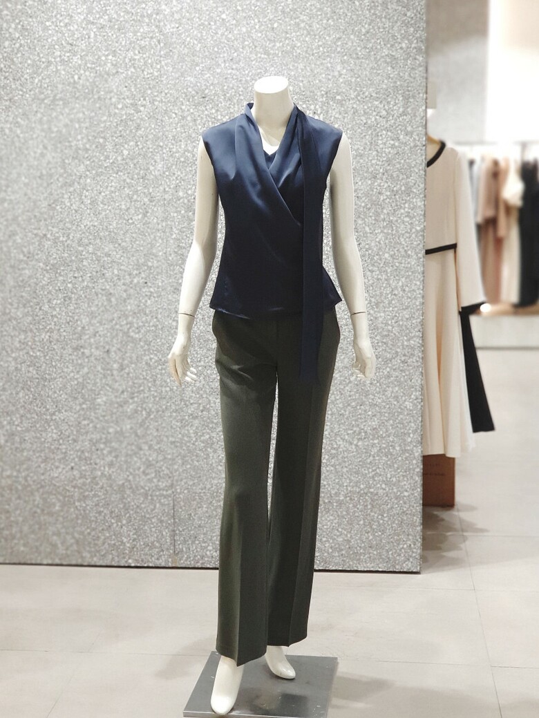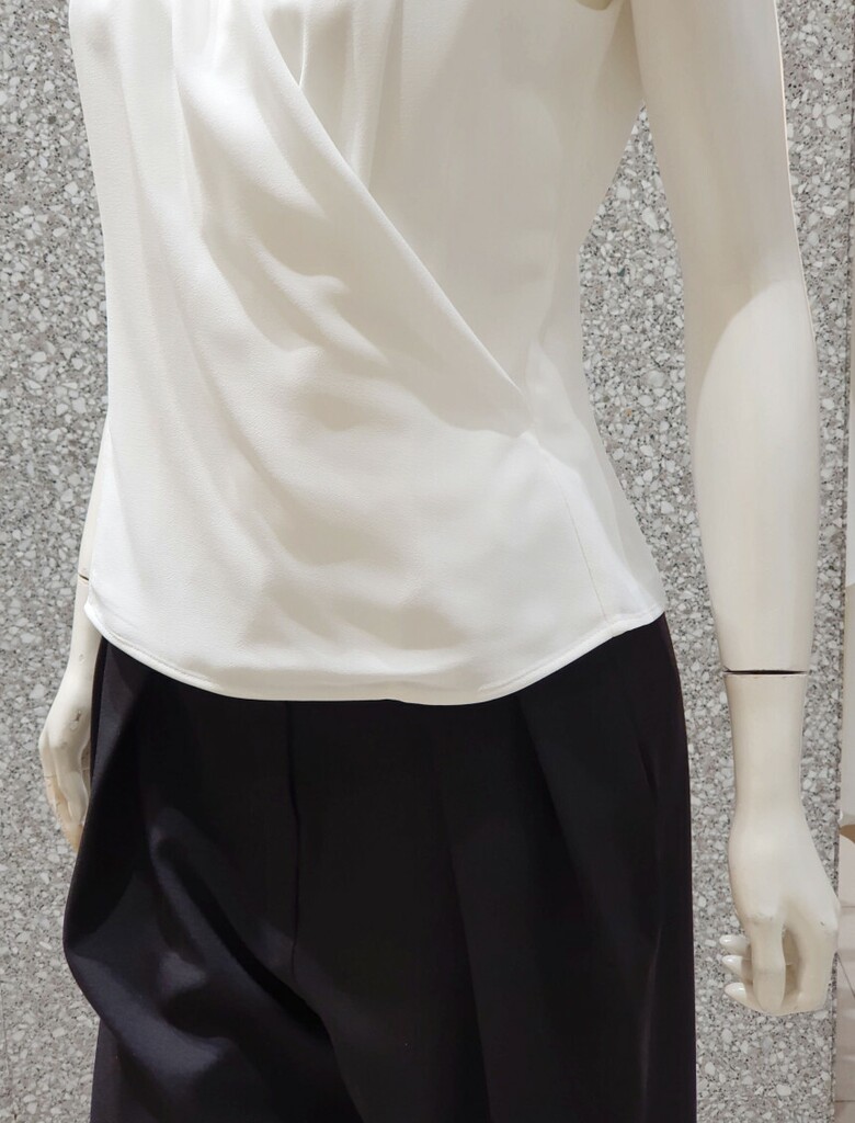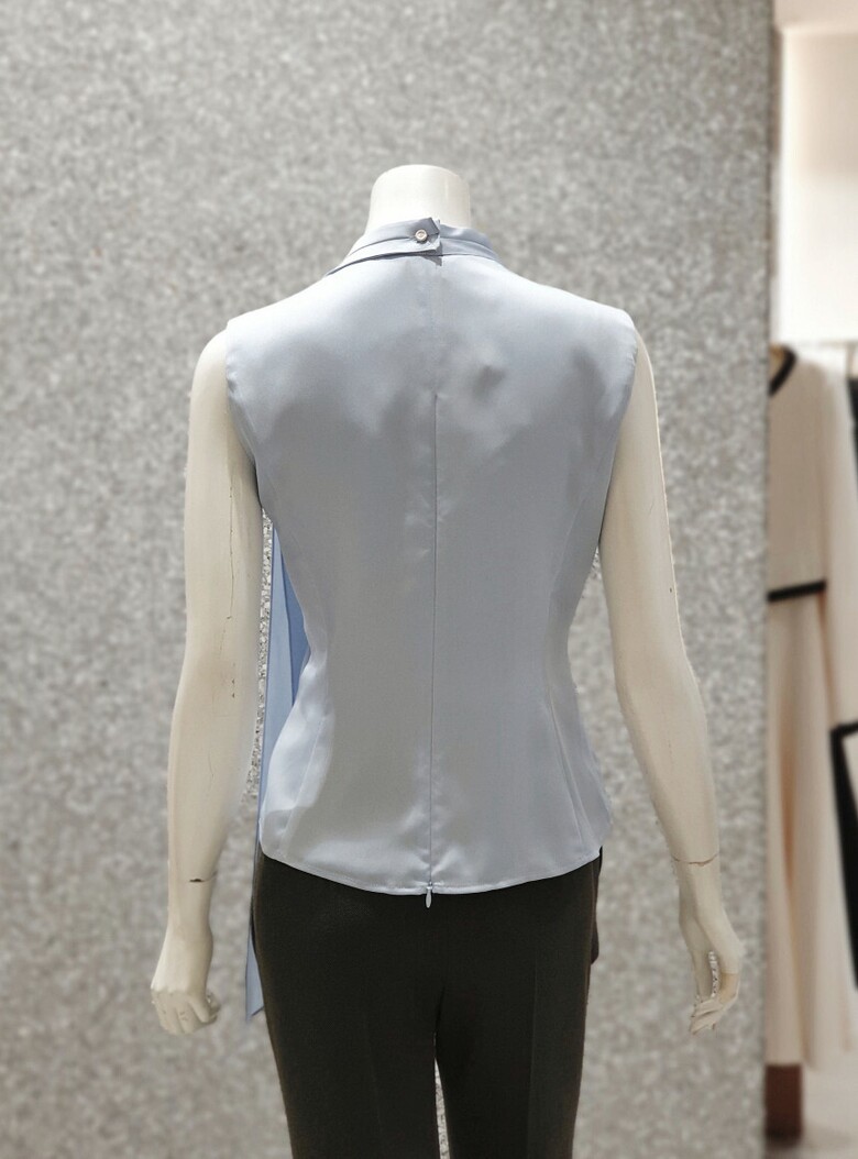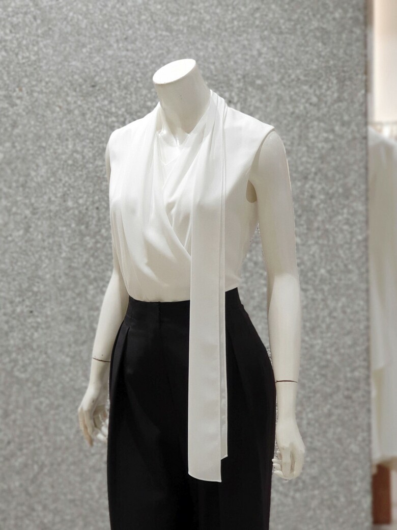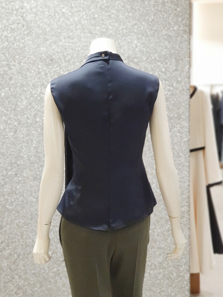우아한 드레이프 실루엣이 돋보이는 민소매 블라우스입니다.