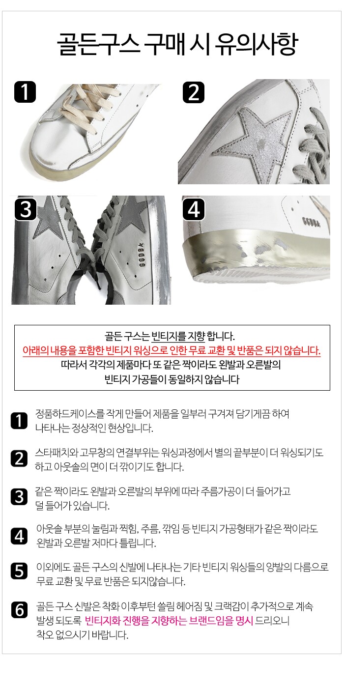 유의사항 신발의 경우 지면과 닿을 수밖에 없는 형태나 부드러운 재질감등의 특성, 개인적 착화 및 도보 스타일에 따른 가죽 및 패브릭 등 제품의 손상 및 쓸림, 마모가 사용기간과는 별개로 정도의 차이로 발생 할 수 밖에 없는 내용으로 당사의 품질보증내용 (A/S, 교환, 반품 등)에 포함되지 않습니다.