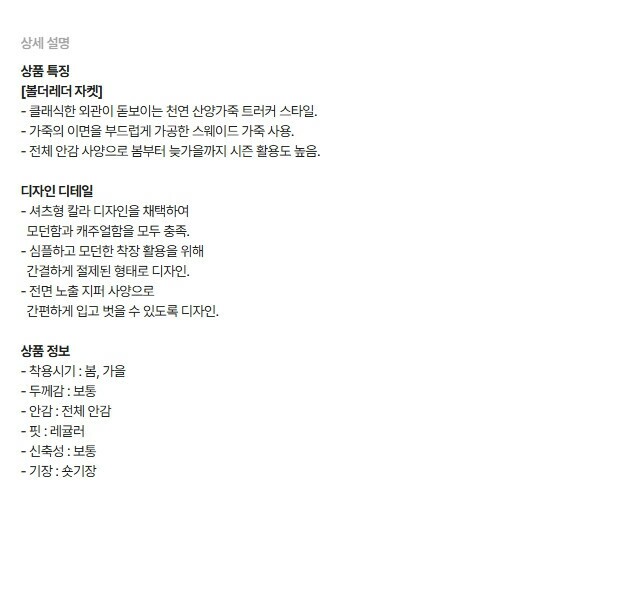 | 1. 제품 소재 (섬유의 조성 또는 혼용률을 백분율로 표시, 기능성인 경우 성적서 또는 허가서) | 상품상세참조 |