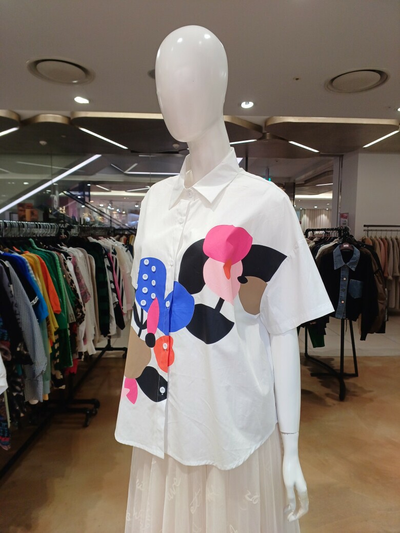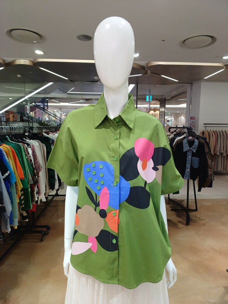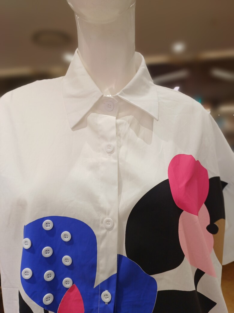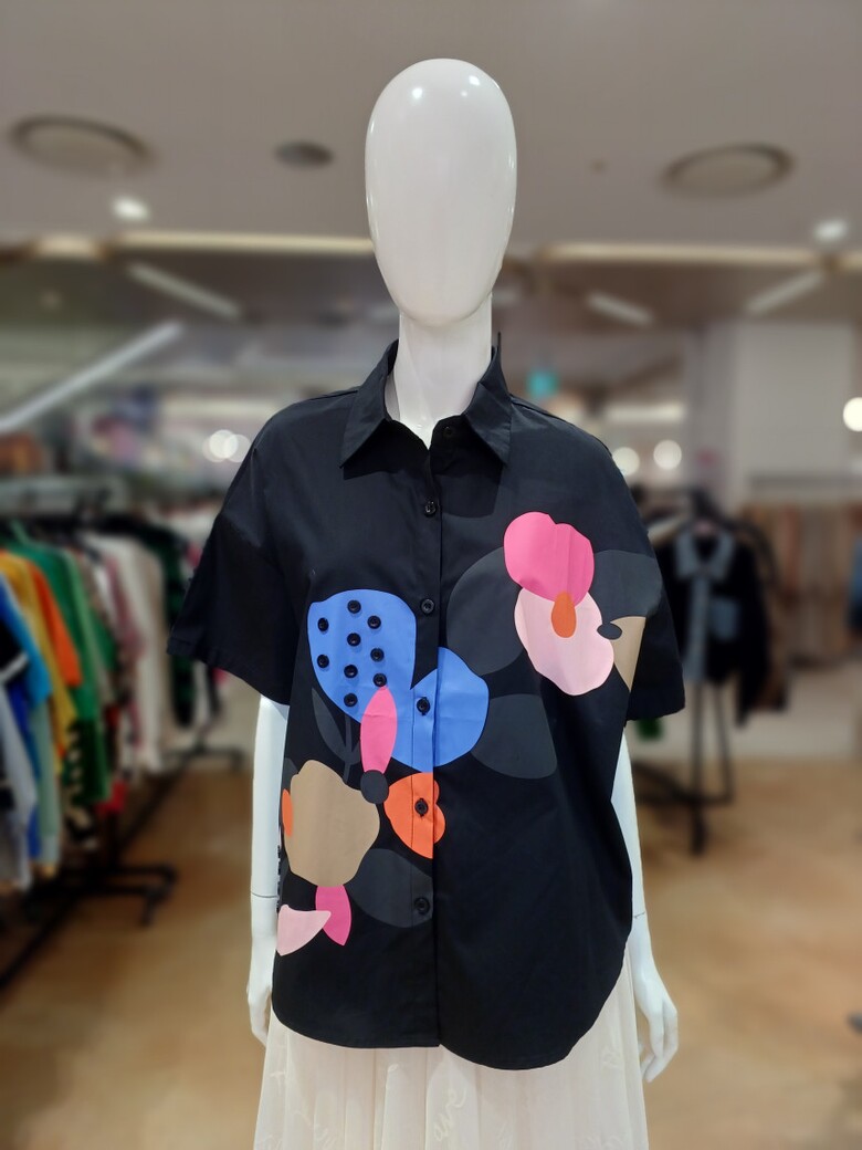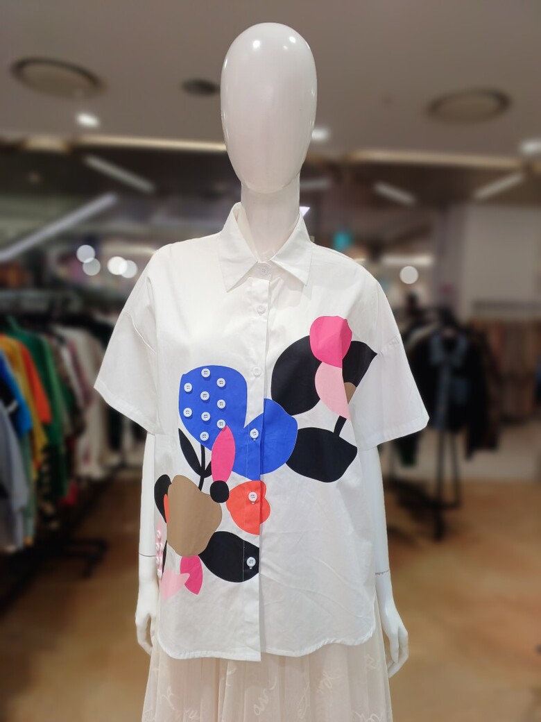 단추 장식 플라워 패턴이 포인트인 셔츠 블라우스입니다