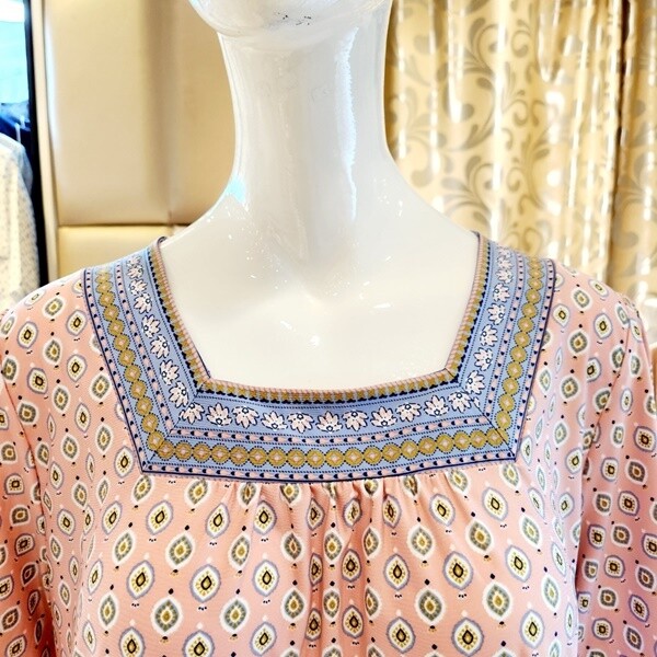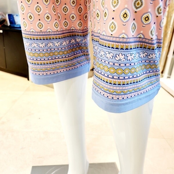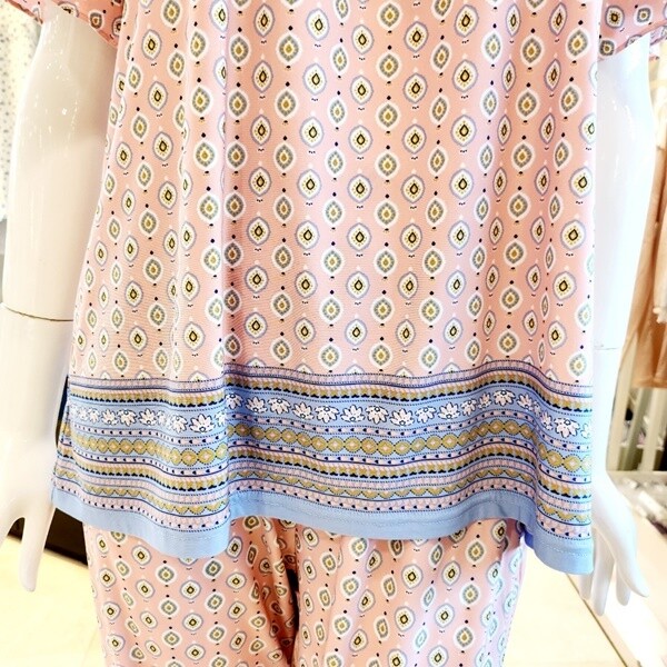 은은한 컬러감의 에스닉 보더 패턴으로,여성스러운 감각의 홈웨어입니다.편안한 기장감으로 활동성이 좋으며신축성이 좋아 편안합니다.