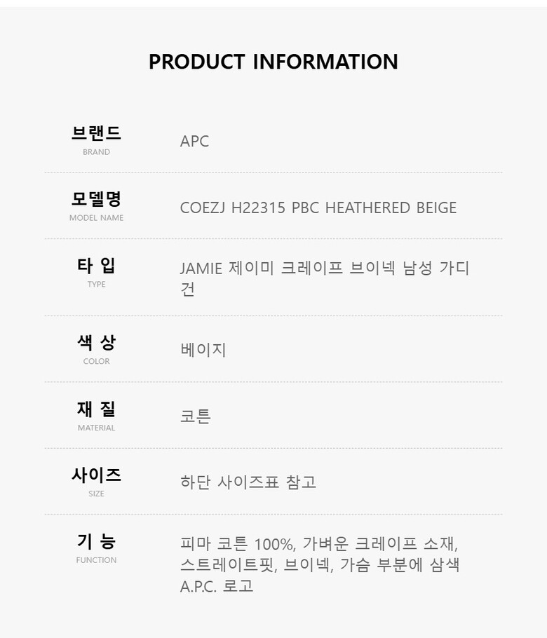 | 1. 제품 소재 (섬유의 조성 또는 혼용률을 백분율로 표시, 기능성인 경우 성적서 또는 허가서) | 상세페이지 참조 |