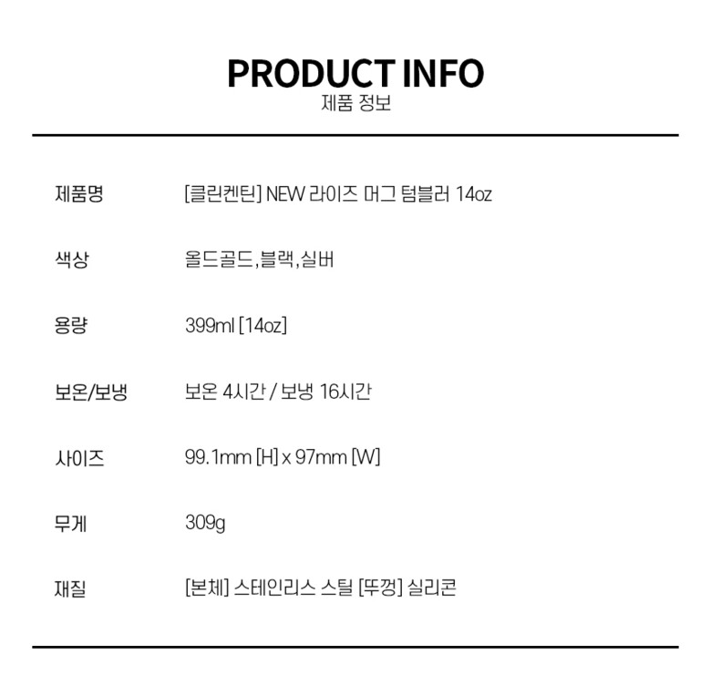 | 1. 품명 및 모델명 | [클린켄틴] 뉴라이즈 보온보냉 머그 텀블러 399ml |