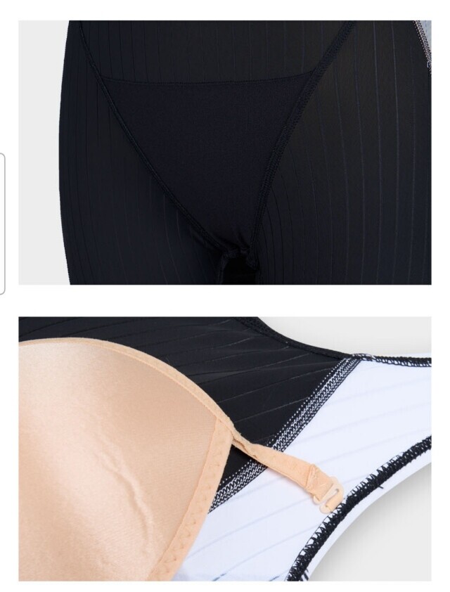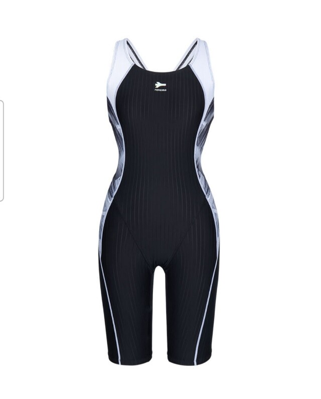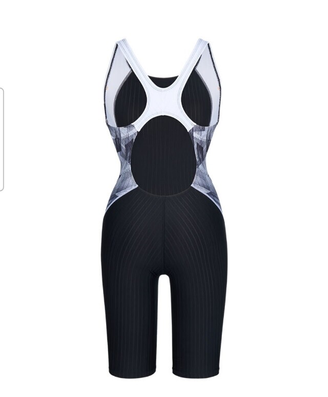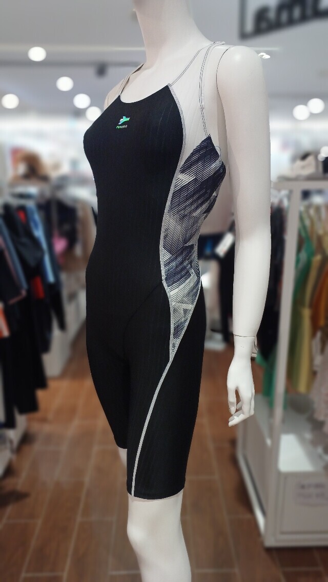 액티브한 기하학 프린트를 사선배치 오드랄프 라인으로 슬림해 보이며 골지원단을 사용한 X백 4부 반신수영복입니다 .