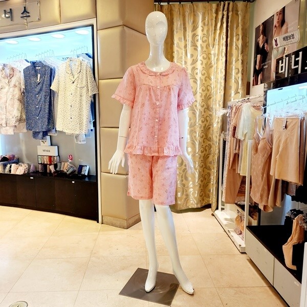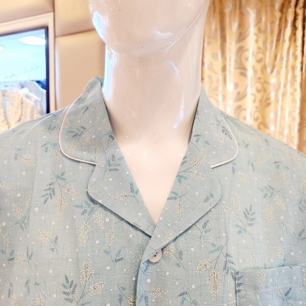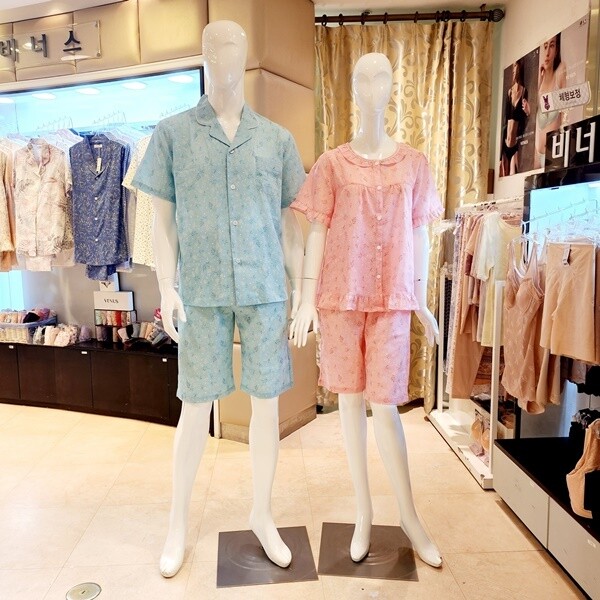 자연스러운 주름 가공된 원단 위에잔꽃 플라워가 포인트인 커플 여름 파자마 입니다.