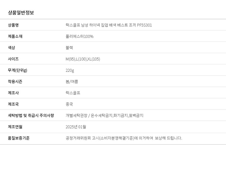 | 1. 제품 소재 (섬유의 조성 또는 혼용률을 백분율로 표시, 기능성인 경우 성적서 또는 허가서) | 상세이미지 참조 |