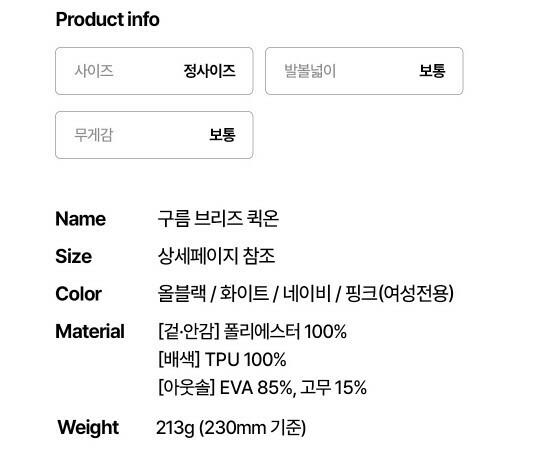 | 1. 제품 소재 (운동화인 경우에는 겉감, 안감을 구분하여 표시) | 상품상세참조 |