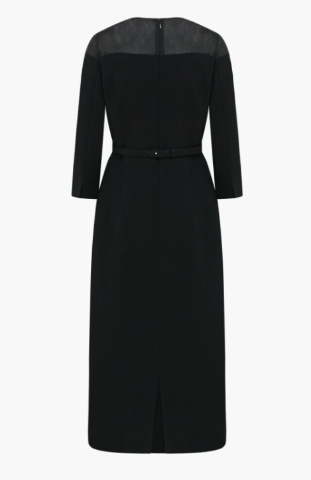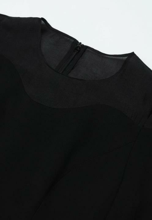 라운드 넥에 시스루 소재를 배색하여 포인트를 주었습니다.