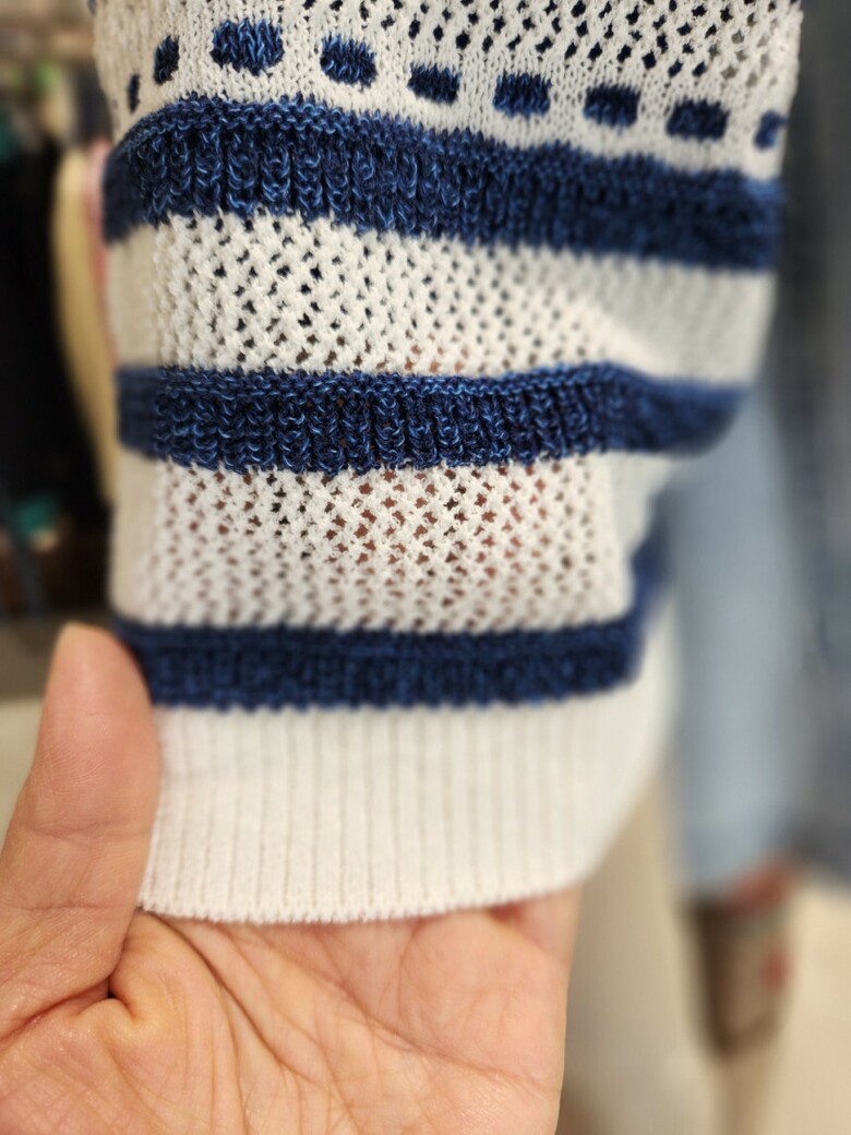 7.니트류는 자가드 프린트 기법으로 제작되어 앞부분에 예쁜 프린트처리가 되어 있습니다
