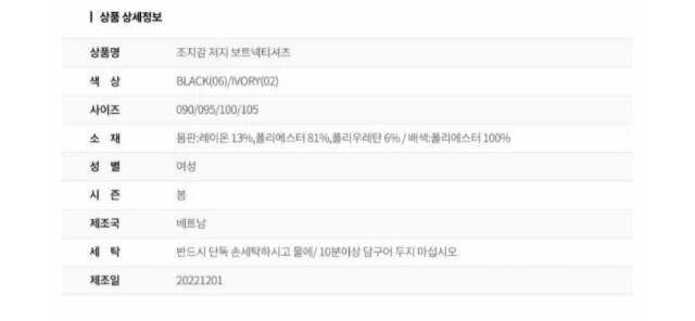 | 1. 제품 소재 (섬유의 조성 또는 혼용률을 백분율로 표시, 기능성인 경우 성적서 또는 허가서) | 상품상세참조 |