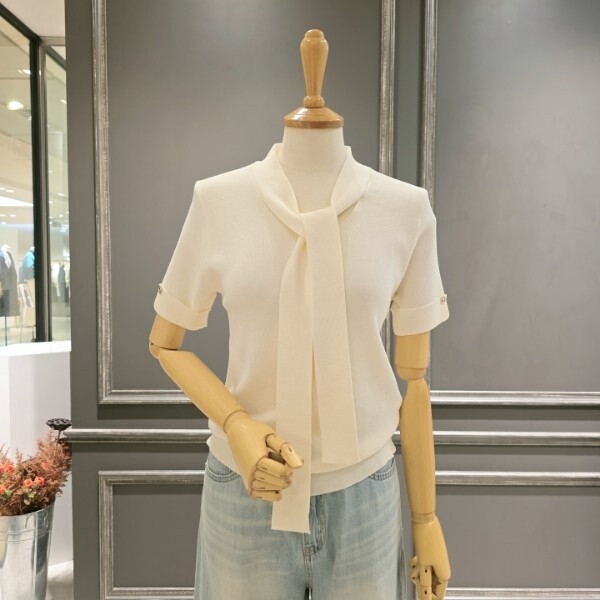 이너로 매치하시기 좋은 브이넥 반팔 니트입니다