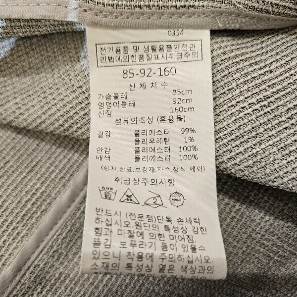 제품소재 : 겉감-폴리에스터99%, 폴리우레탄1%, 안감-폴리에스터100%, 배색-폴리에스터100%