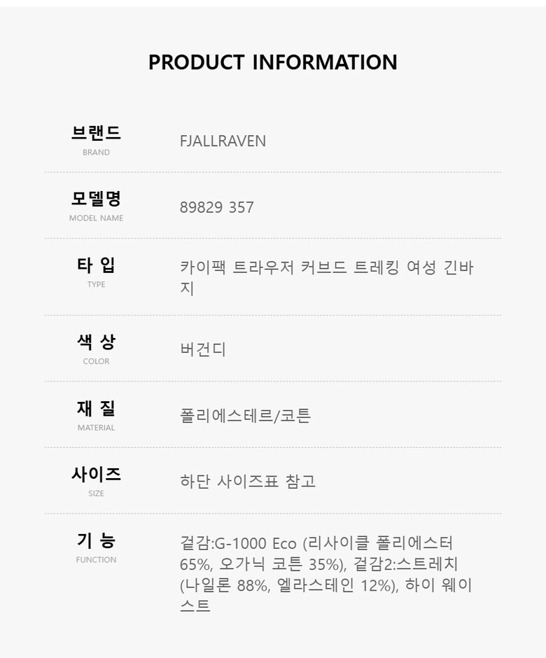 피엘라벤 바지 89829 357 카이팩 트라우저 커브드 트레킹 여성바지 당일발송