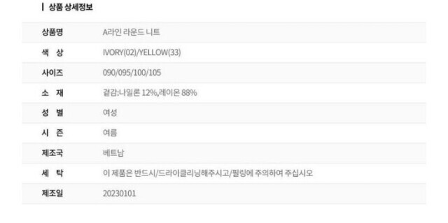 | 1. 제품 소재 (섬유의 조성 또는 혼용률을 백분율로 표시, 기능성인 경우 성적서 또는 허가서) | 상품상세참조 |
