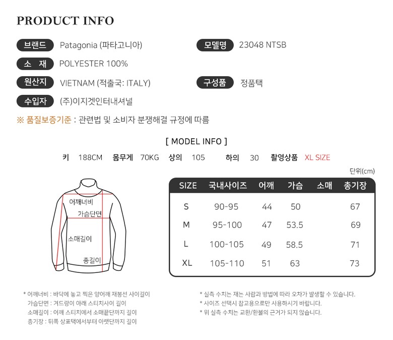 | 1. 제품 소재 (섬유의 조성 또는 혼용률을 백분율로 표시, 기능성인 경우 성적서 또는 허가서) | 상세페이지 참조 |