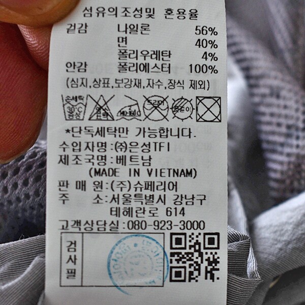 | 1. 제품 소재 (섬유의 조성 또는 혼용률을 백분율로 표시, 기능성인 경우 성적서 또는 허가서) | 나일론56%면40%폴리우레탄4% |