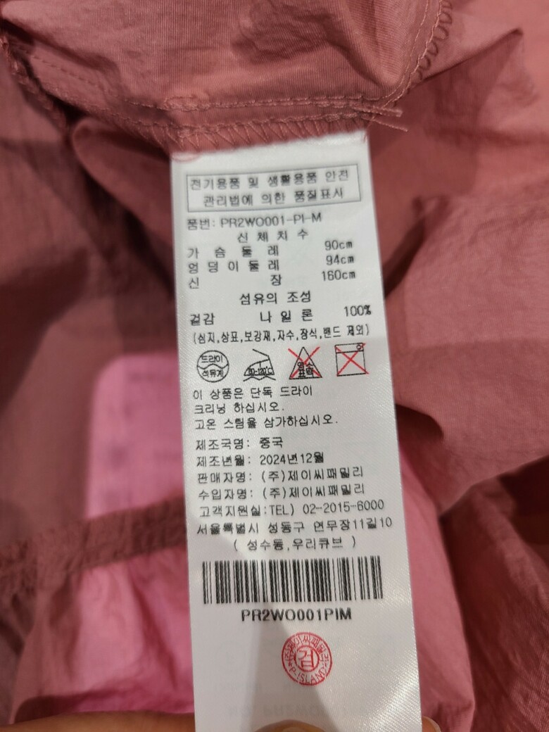 | 1. 제품 소재 (섬유의 조성 또는 혼용률을 백분율로 표시, 기능성인 경우 성적서 또는 허가서) | 겉감:나일론 100% |