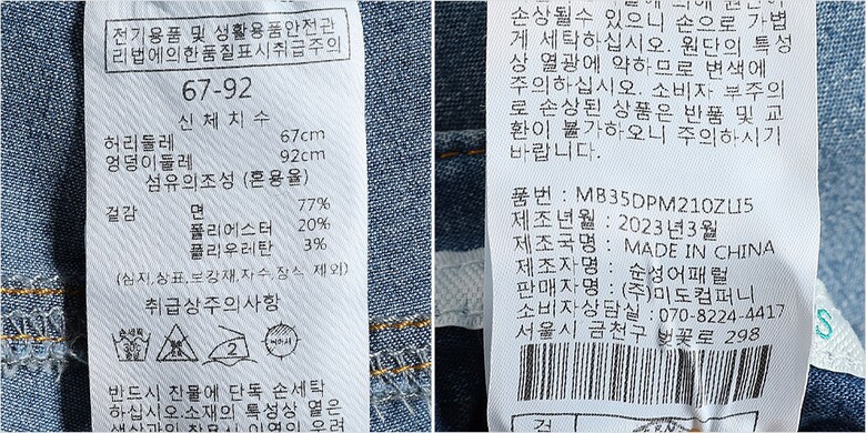 1. 제품 소재 (섬유의 조성 또는 혼용률을 백분율로 표시, 기능성인 경우 성적서 또는 허가서) 겉감-면77% 폴리에스터20% 폴리우레탄3%