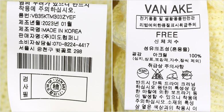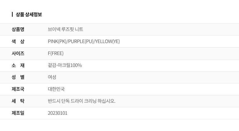 | 1. 제품 소재 (섬유의 조성 또는 혼용률을 백분율로 표시, 기능성인 경우 성적서 또는 허가서) | 겉감-아크릴100% |