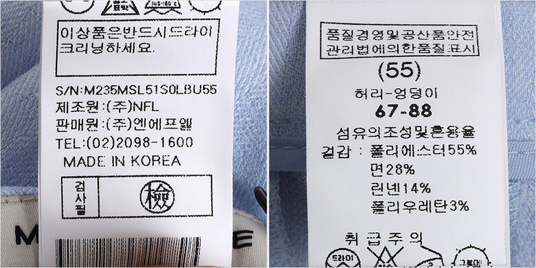 | 1. 제품 소재 (섬유의 조성 또는 혼용률을 백분율로 표시, 기능성인 경우 성적서 또는 허가서) | 겉감-면28% 폴리에스터55% 폴리우레탄3% 린넨14% |