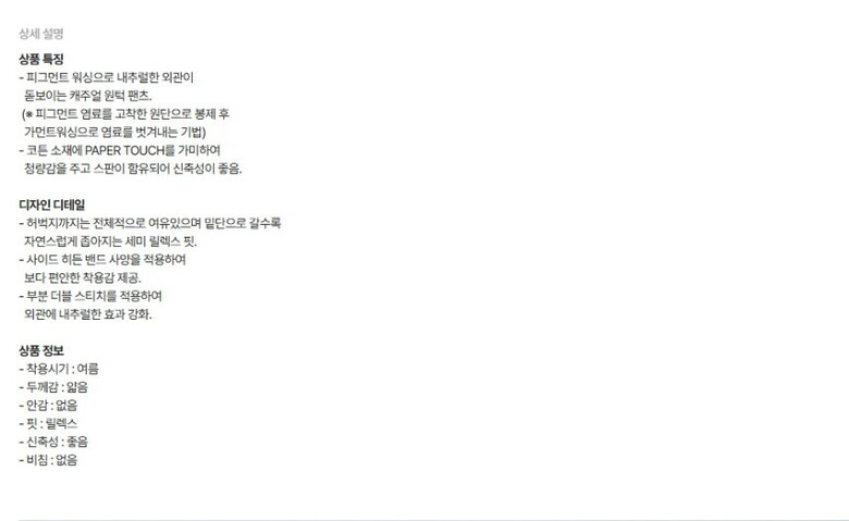 | 1. 제품 소재 (섬유의 조성 또는 혼용률을 백분율로 표시, 기능성인 경우 성적서 또는 허가서) | 상품상세참조 |