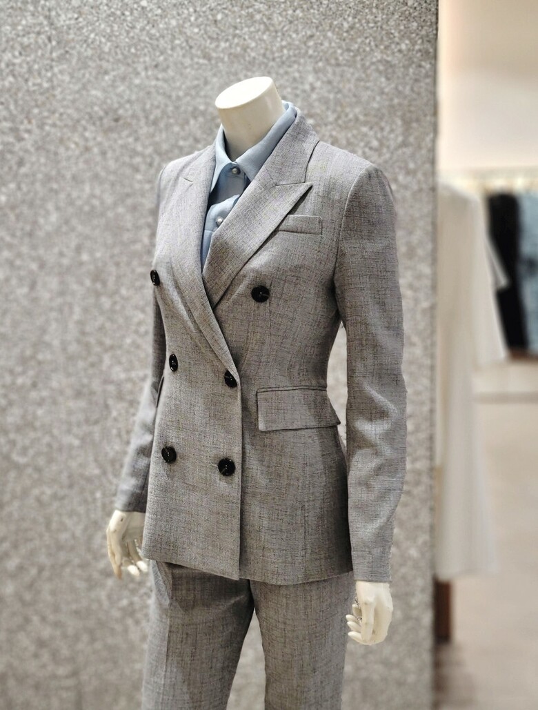 피크드 라펠 칼라 디자인으로 네크 맵시를 더하며