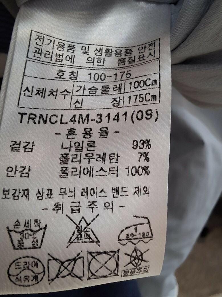 1. 제품 소재 (섬유의 조성 또는 혼용률을 백분율로 표시, 기능성인 경우 성적서 또는 허가서) 겉감:나일론 93%, 폴리우레탄 7% / 안감:폴리에스테르 100%