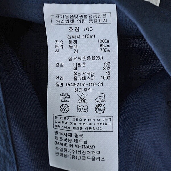 제품소재 : 겉감 - 나일론 73%, 면 23%, 폴리우레탄 4%안감 - 폴리에스터 100%