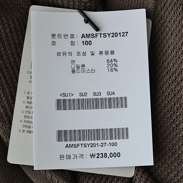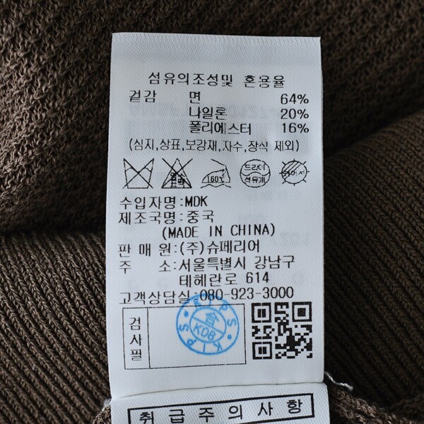 | 1. 제품 소재 (섬유의 조성 또는 혼용률을 백분율로 표시, 기능성인 경우 성적서 또는 허가서) | 면64%나일론20%폴리에스터16% |