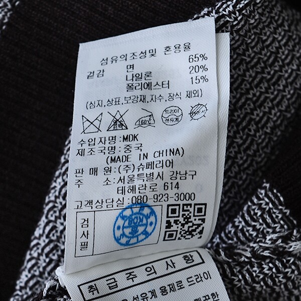| 1. 제품 소재 (섬유의 조성 또는 혼용률을 백분율로 표시, 기능성인 경우 성적서 또는 허가서) | 면65%나일론20%폴리에스터15% |