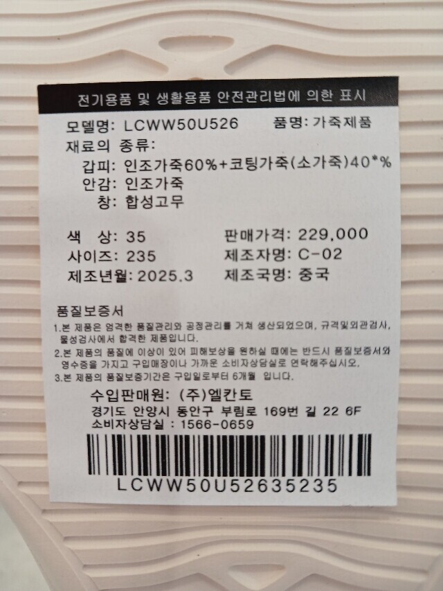 | 1. 제품 소재 (운동화인 경우에는 겉감, 안감을 구분하여 표시) | 상품상세참조 |