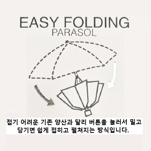 | 6. 취급시 주의사항 | 무리하게 펼칠시 고장의 원인이 되므로 제품을 가볍게 좌우로 흔들어 접힌 원단을 풀어준 후 펼쳐주세요 사용후 통풍이 잘되는그늘에 말려 보관하세요 우.양산의 중봉이 휘지 않도록 강한 바람이나 충격에 주의하세요 |