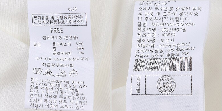 | 1. 제품 소재 (섬유의 조성 또는 혼용률을 백분율로 표시, 기능성인 경우 성적서 또는 허가서) | 겉감-면39% 폴리에스터52% 폴리우레탄9% |