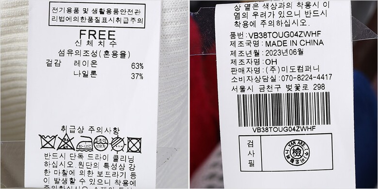 1. 제품 소재 (섬유의 조성 또는 혼용률을 백분율로 표시, 기능성인 경우 성적서 또는 허가서) | 겉감-나일론37% 레이온63% |