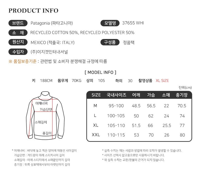 | 1. 제품 소재 (섬유의 조성 또는 혼용률을 백분율로 표시, 기능성인 경우 성적서 또는 허가서) | 상세페이지 참조 |