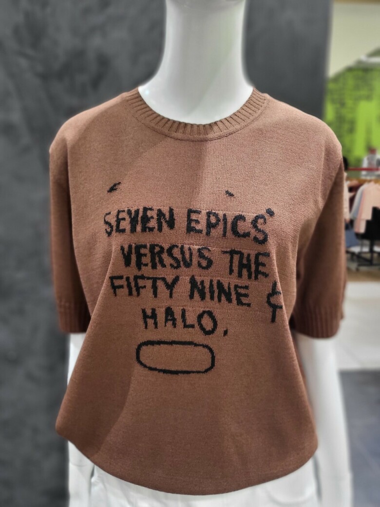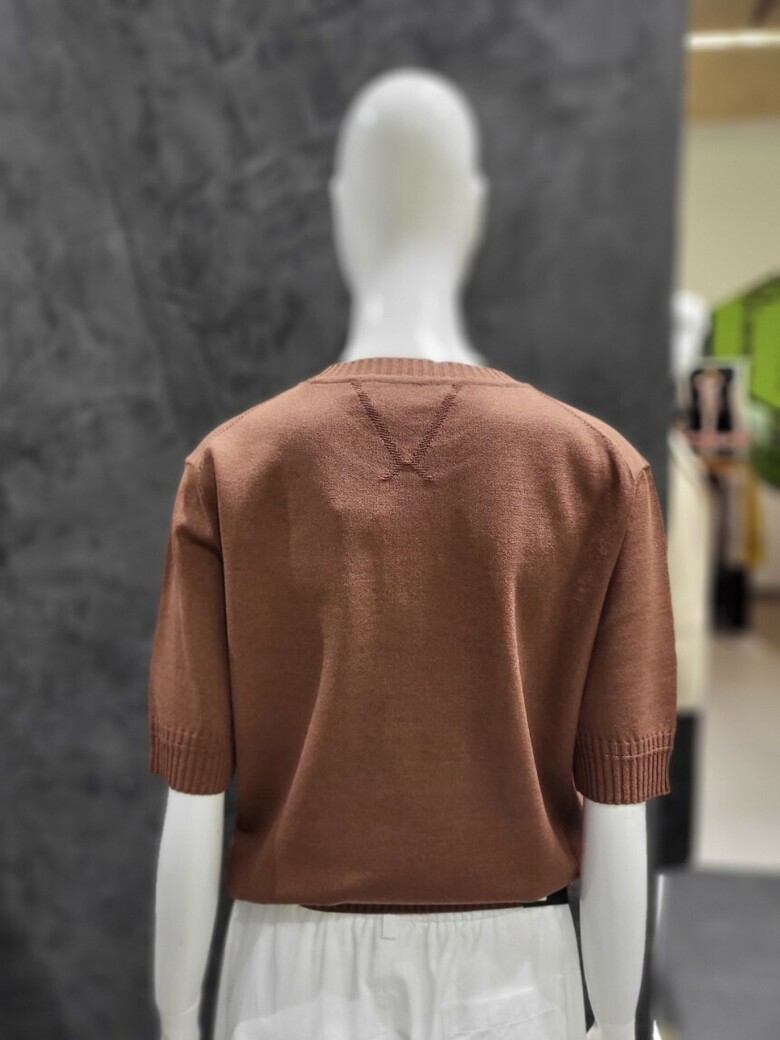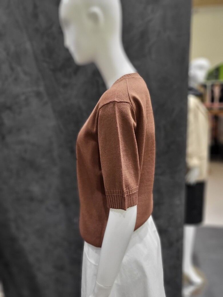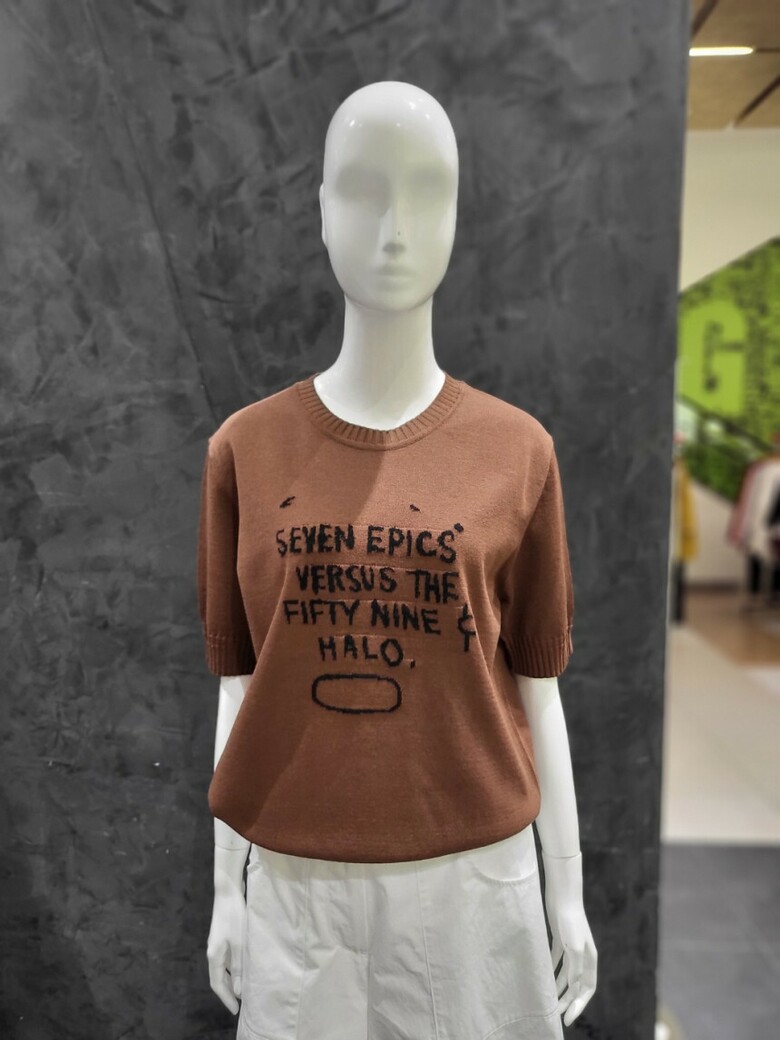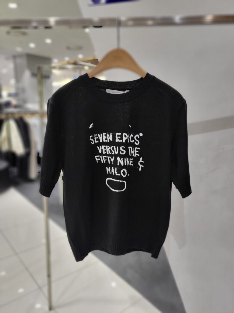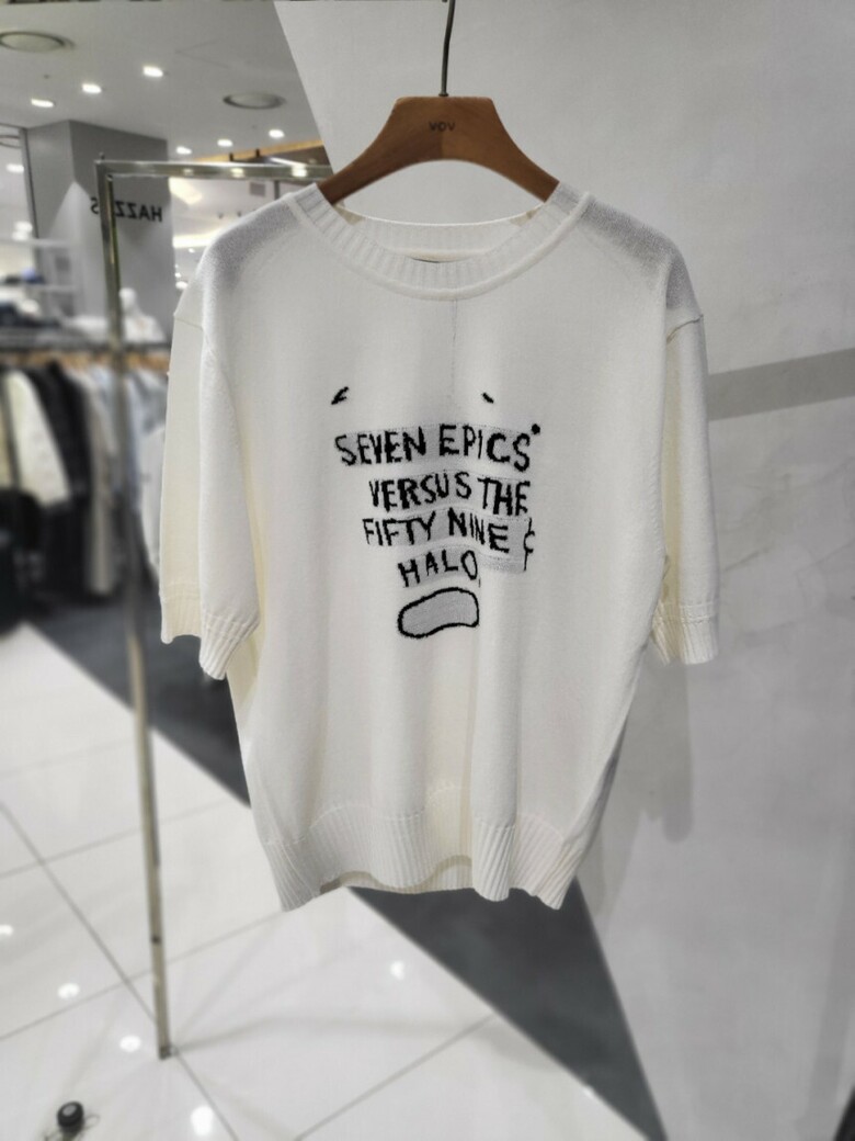 앞면 레터링 포인트가 돋보이는 반팔 니트입니다